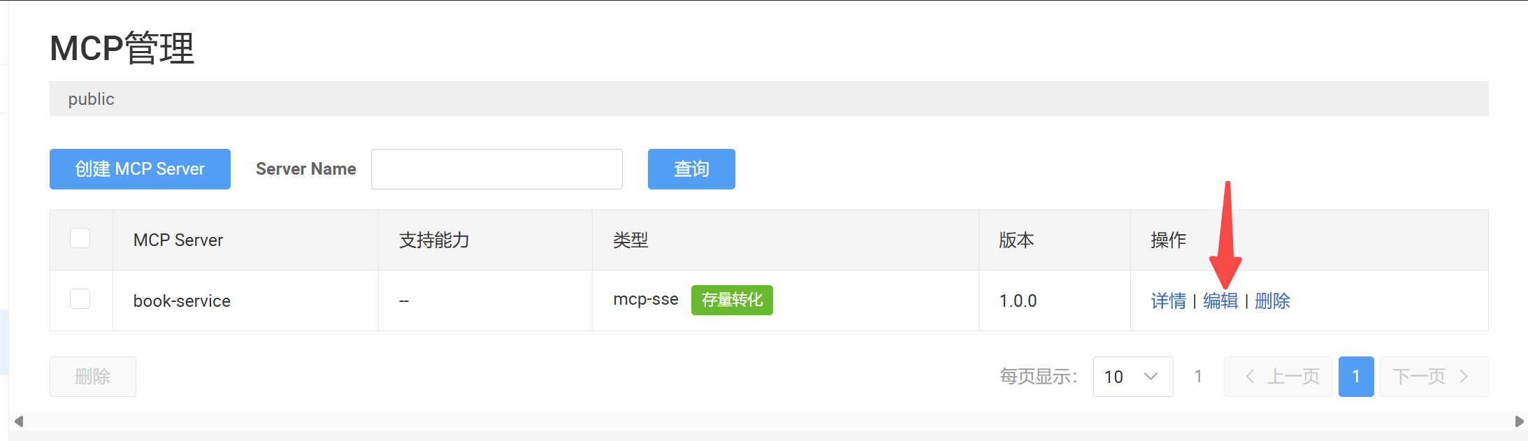 MCP服务创建后,我们需要将具体的API接口声明为可调用的Tools。在MCP列表中找到刚创建的服务,点击操作列的编辑按钮。