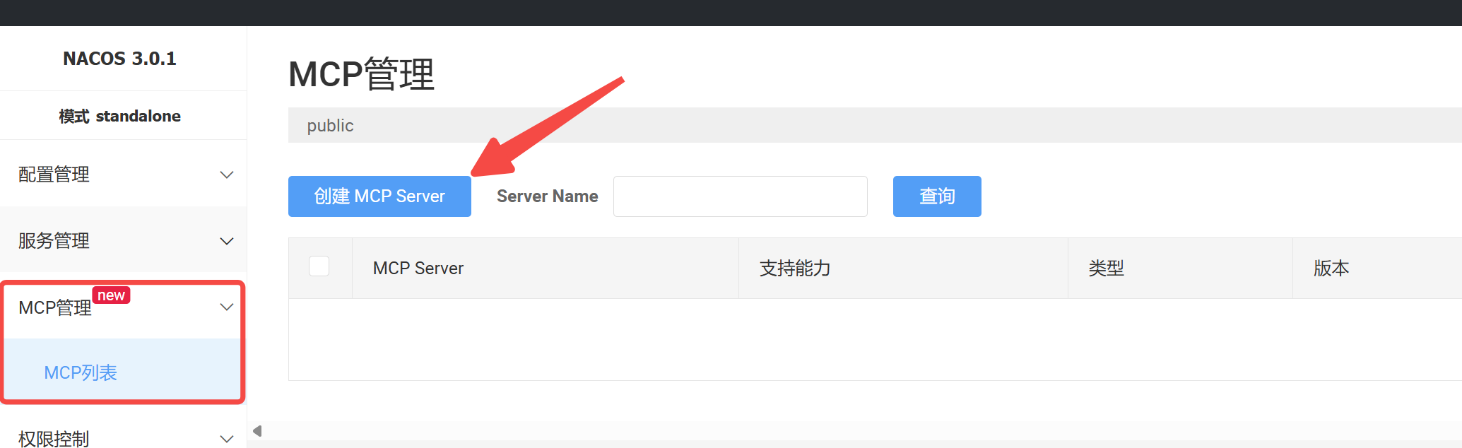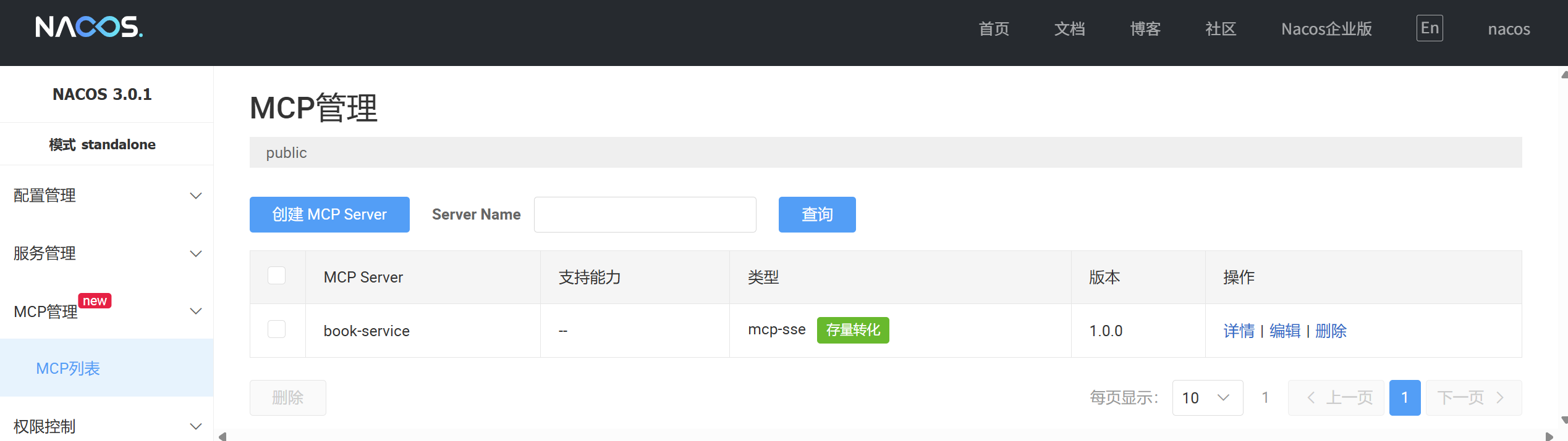 首先,我们需要在Nacos中将已注册的服务声明为MCP服务,进入nacos控制台,点击左侧 MCP管理 -> MCP列表 进入MCP管理页面。