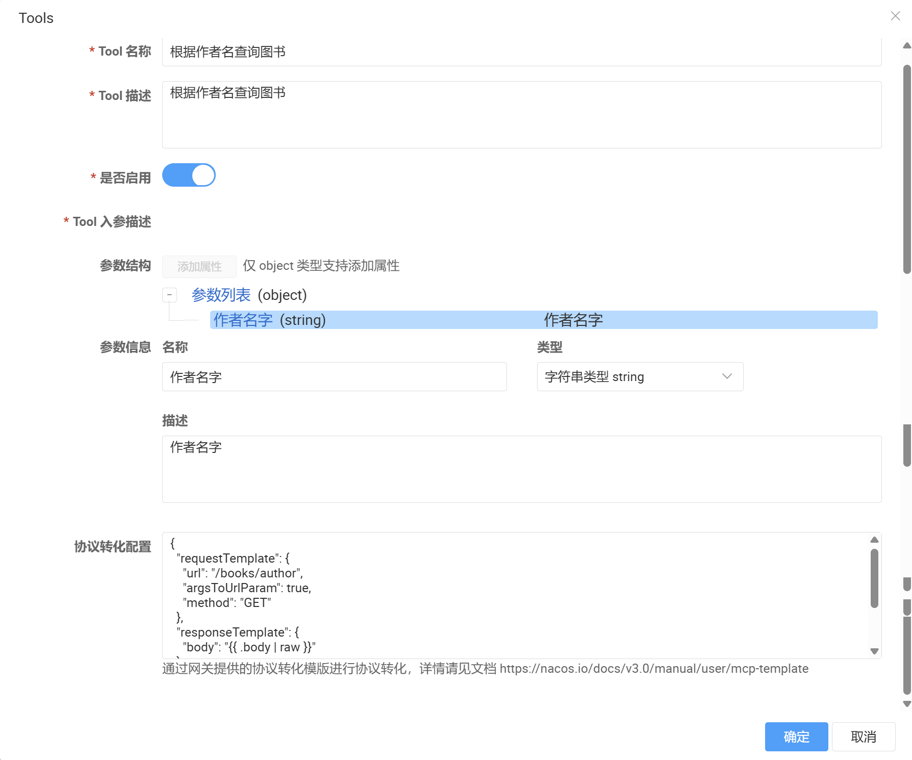 getBooksByAuthorauthorName 参数协议转换配置是整个改造的核心,它定义了如何将MCP调用转换为HTTP请求。官方文档中提供了模板,这里我以我的配置做下说明: