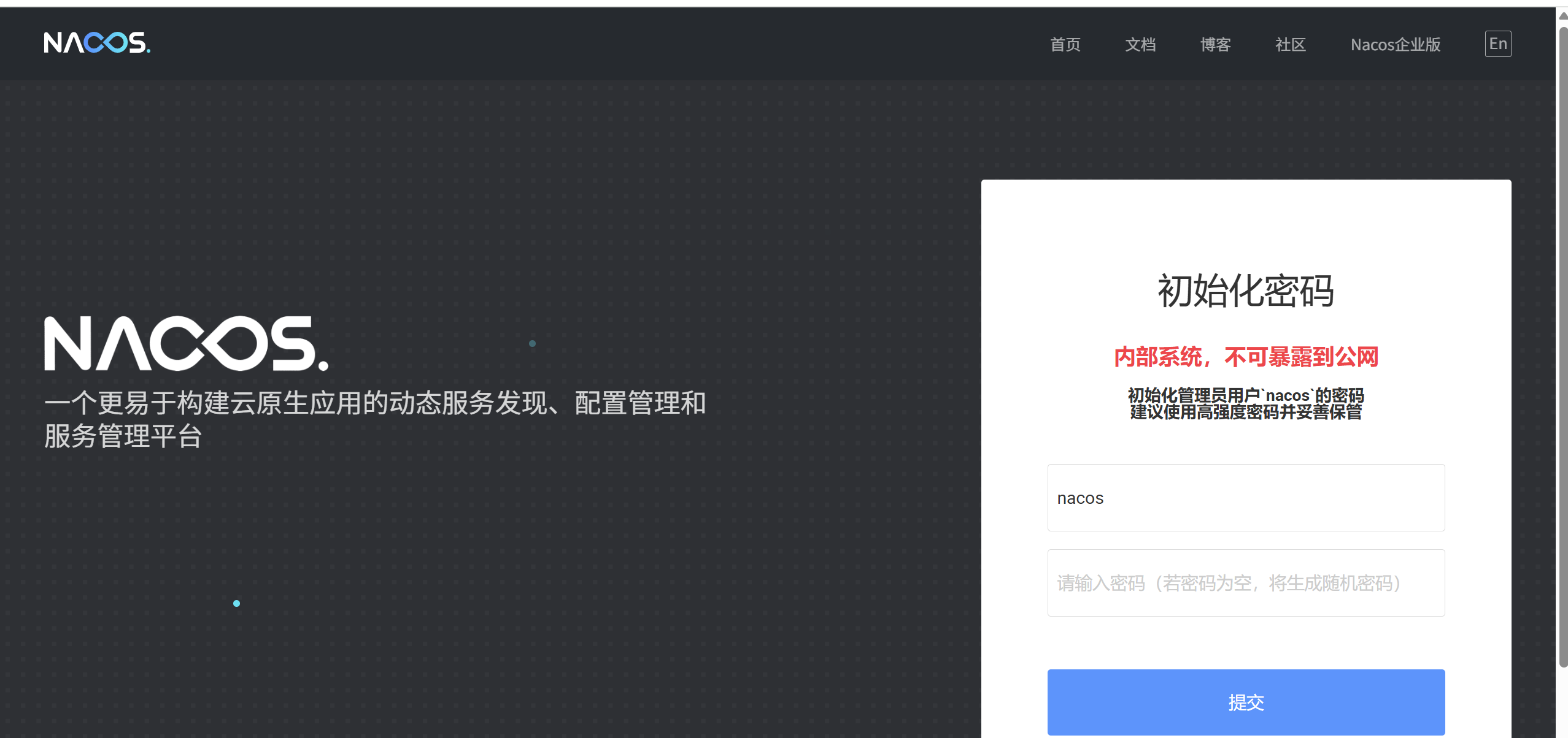 首次登录需要完成初始化配置,设置管理员密码后,系统会自动跳转到登录页面。