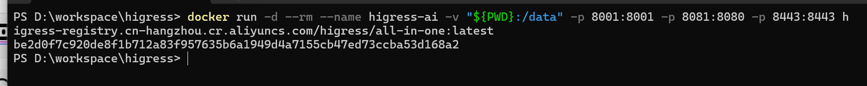 docker run -d --rm --name higress-ai -v "${PWD}:/data" -p 8001:8001 -p 8081:8080 -p 8443:8443 higress-registry.cn-hangzhou.cr.aliyuncs.com/higress/all-in-one:latest注意:命令中的 -v "${PWD}:/data" 会将当前目录挂载到容器中,用于保存配置数据。建议先创建一个专用文件夹(如 D:\higress-data),然后在该目录下执行上述命令。