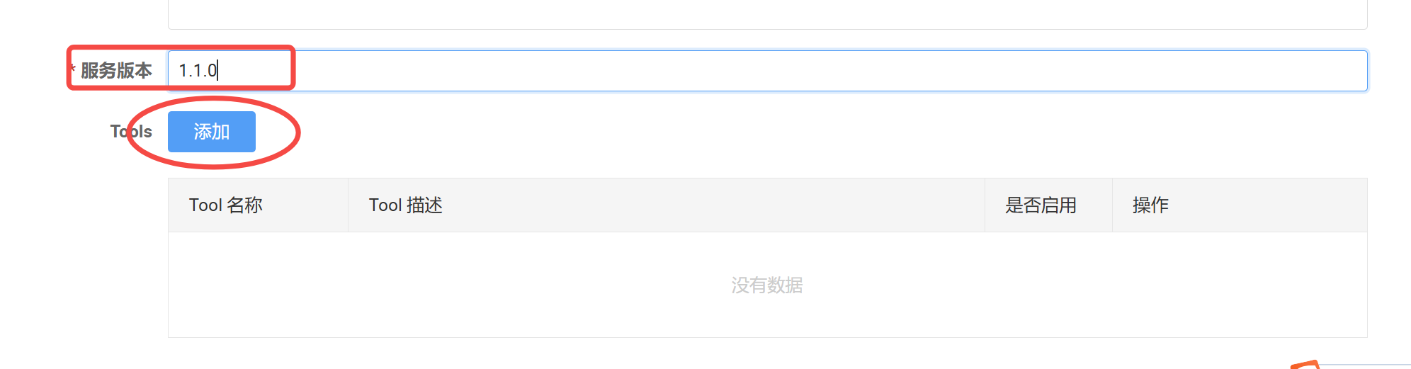 在编辑页面中,将服务版本修改为新版本(如 1.1.0)。版本号更新后,页面下方的Tools区域会出现添加按钮。