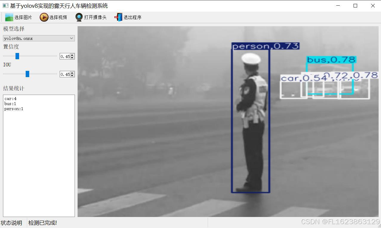 该系统首先通过雾天检测摄像头实时捕捉当前画面,并对这些视频和图片信息进行算法处理。YOLOv8模型能够直接预测对象的中心,无需依赖锚框,这使得它在雾天等复杂环境中具有更高的检测精度和稳定性。经过训练和优化,该系统能够在雾天条件下准确识别道路上的行人和车辆,包括车辆类型(如汽车、公交车、自行车等)和行人。
