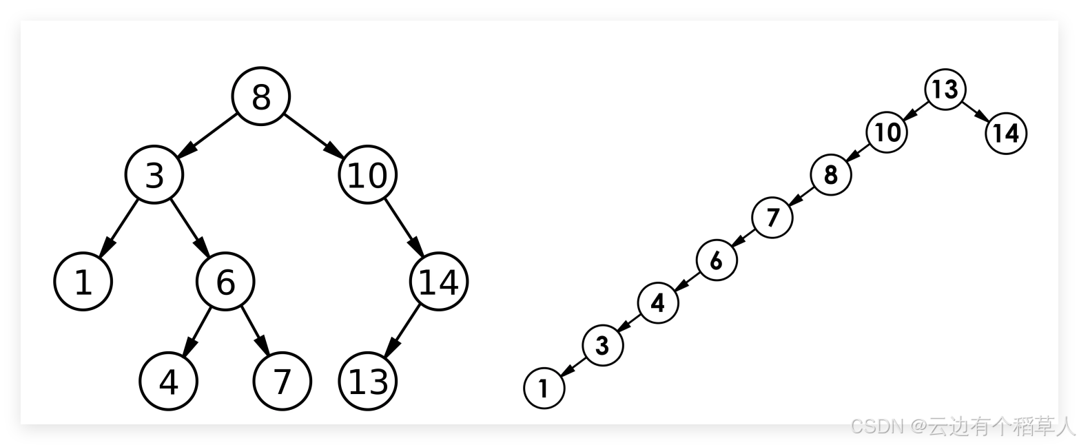 最差情况下,⼆叉搜索树退化为单⽀树(或者类似单⽀),其高度为: N