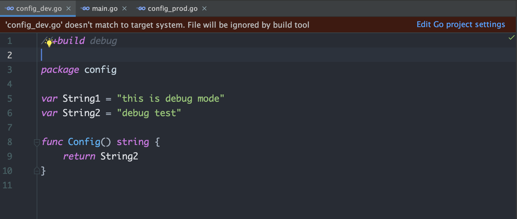 4、 使用条件编译 分别编写config_prod.go 和 config_dev.go 分别代表生产环境和开发环境的配置。 项目布局如下