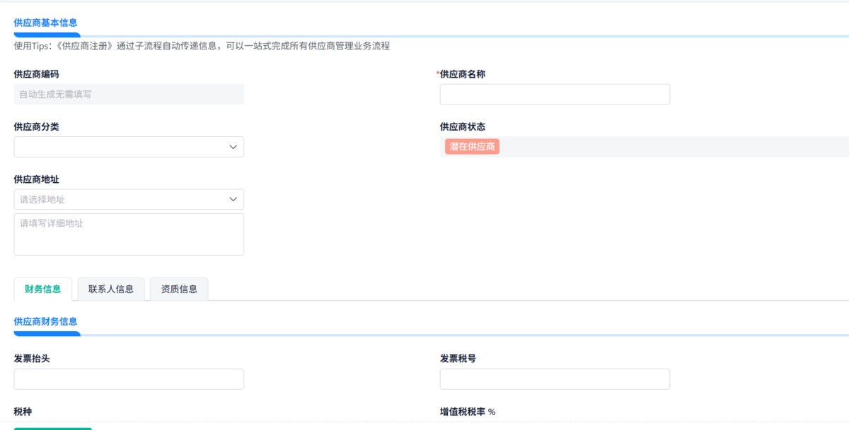 功能概述:该模块用于管理供应商的注册、资质审核、合同签订等准入环节。企业通过此模块,能够确保供应商符合企业的合规要求。