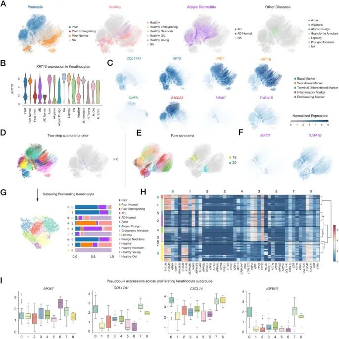 图6D-E 展示了整合方法对增殖性角质形成细胞聚类的影响,D 和 E 分别为使用两步 scanorama-prior 和原始 scanorama 进行聚类的结果,图右侧是识别出的高增殖角质形成细胞亚群,原始方法因批次效应校正不足,将同一增殖亚群错误拆分为两个独立簇。图6F 为在原始 scanorama 整合的 UMAP 上可视化增殖基因的表达,表达模式被干扰,无法清晰识别单一增殖亚群。图6G 为高增殖亚群在不同疾病中的比例。图6H 为增殖性角质形成细胞亚群的差异基因热图。图6I 比较了 MKI67、COL17A1、IGFBP3、CXCL14 在增殖亚群中的表达水平,cluster0(银屑病)中 CXCL14(通常具有抗炎作用)高表达。