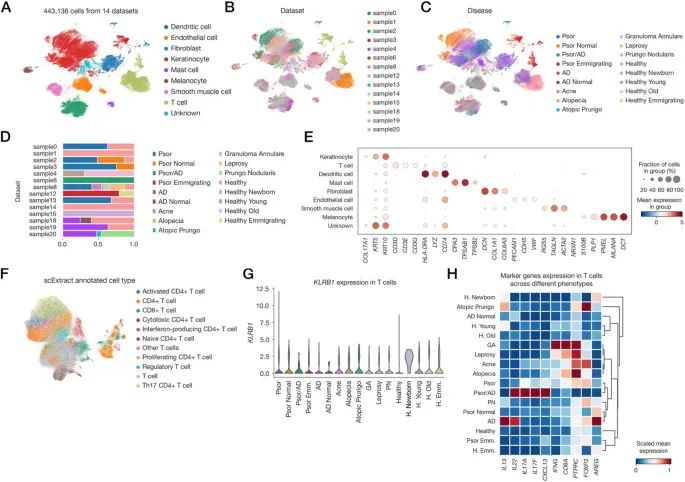 通过完全自动化流程(无人工干预)整合 14 个皮肤 scRNA-seq 数据集(涵盖健康、银屑病、特应性皮炎等状态)。