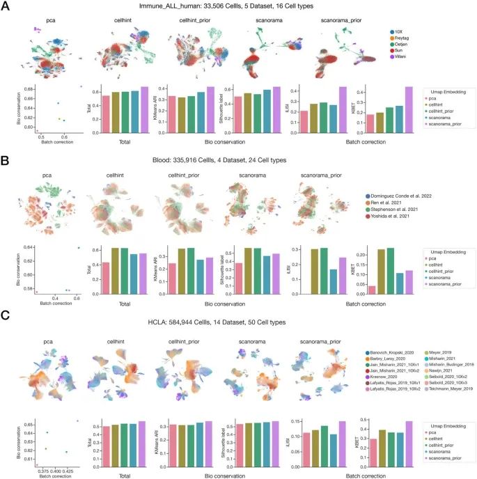 图4 对免疫细胞、血液细胞、人类肺细胞三类细胞进行大规模数据集的整合,上排为 UMAP 可视化对比不同整合方法的结果,下排为量化指标,从左到右依次为:散点图展示批次效应去除和生物学差异保留之间的平衡;柱状图分别呈现综合性能指标、KMeans ARI、Silhouette Label、iLISI 和 kBET,其中 KMeans ARI 反映聚类与真实类型一致性;Silhouette Label 代表同类细胞聚集紧密度;iLISI 表示批次混合度;kBET 反映批次随机分布程度。