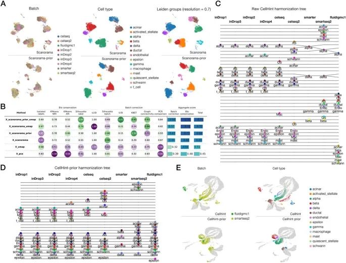 图3C-D 分别为 cellhint 和 cellhint-prior 的细胞类型对齐树图。每一列代表一个独立的 batch,每个点代表一个细胞亚群,水平线连接不同数据集中被判定为相同细胞类型的群,线的粗细代表置信度的高低。原始 cellhint 仅能成功对齐 inDrop 内部批次,引入先验知识后所有平台的同类细胞被正确对齐。图3E 为 cellhint vs cellhint-prior 可视化结果的比较。原始 cellhint 批次间仍有明显分离,cellhint-prior 不同批次同类型细胞完全混合。