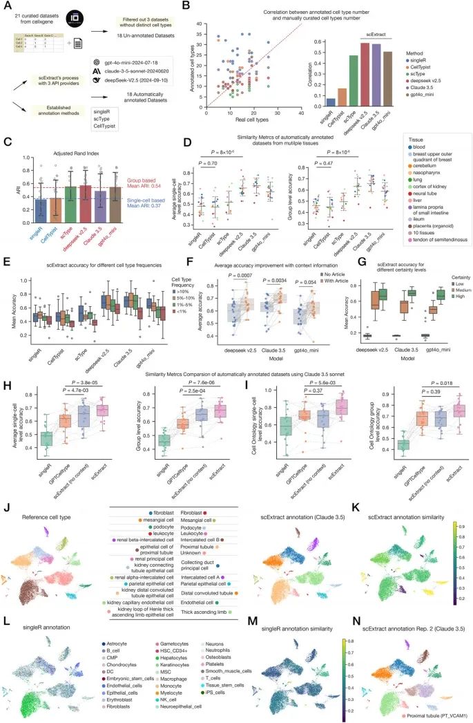 图2J 为肾脏数据集的可视化,表格左边为人工注释的金标准,右边为 scExtract(Claude 3.5)自动注释结果。图2K-M 分别是使用 scExtract 和 SingleR 进行自动注释的可视化结果和与金标准的注释相似性。图2N 为 scExtract 第二次重复运行的注释结果,首次运行标记为"Unknown"的细胞亚群被正确注释。