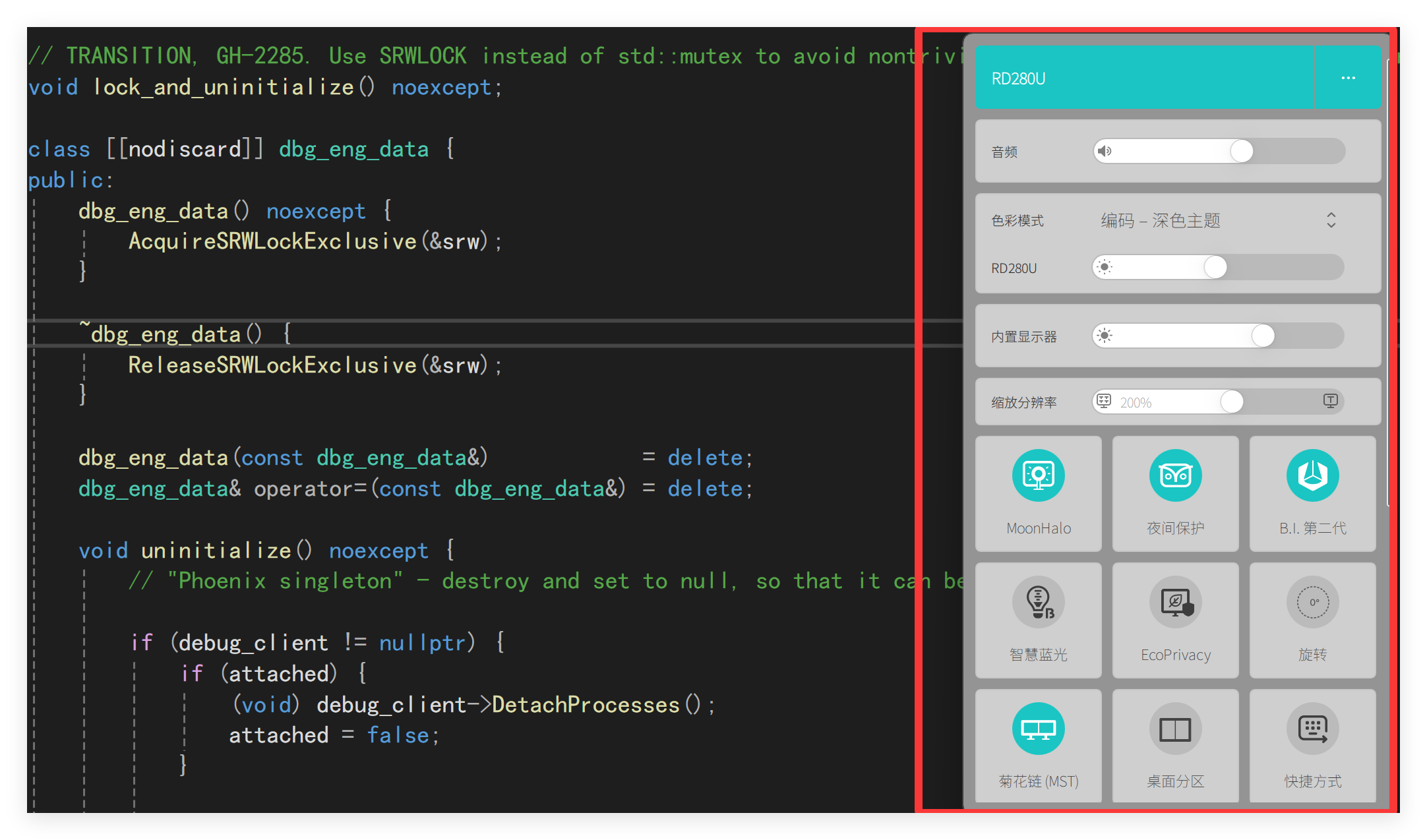 无论是白天的阳光照射,还是室内的强光,(1)它的抗反射面板都有效地减少了这些干扰。第一次在阳光下使用这台显示器时,我几乎没有看到明显的反射光,屏幕的内容仍然非常清晰。这让我在处理代码、调试、浏览文档时,眼睛不再受到反射光的困扰,工作变得更加高效。(2)而且RD280U的抗反射面板不仅仅是减少了强光的干扰,它还让屏幕的色彩和细节更加鲜明。