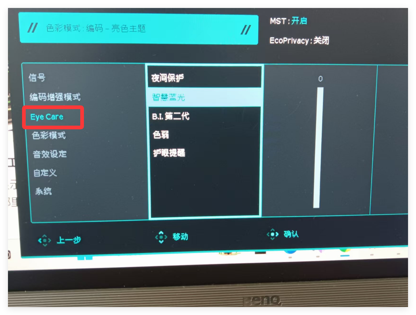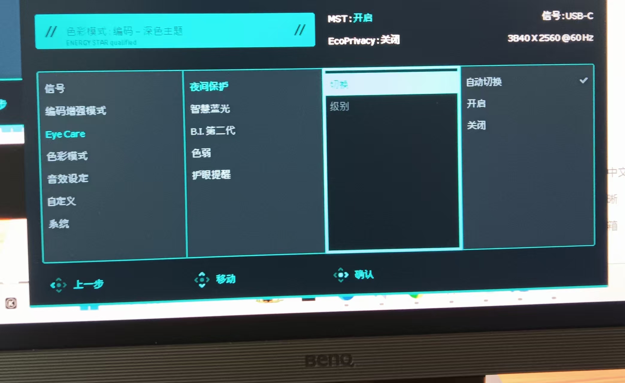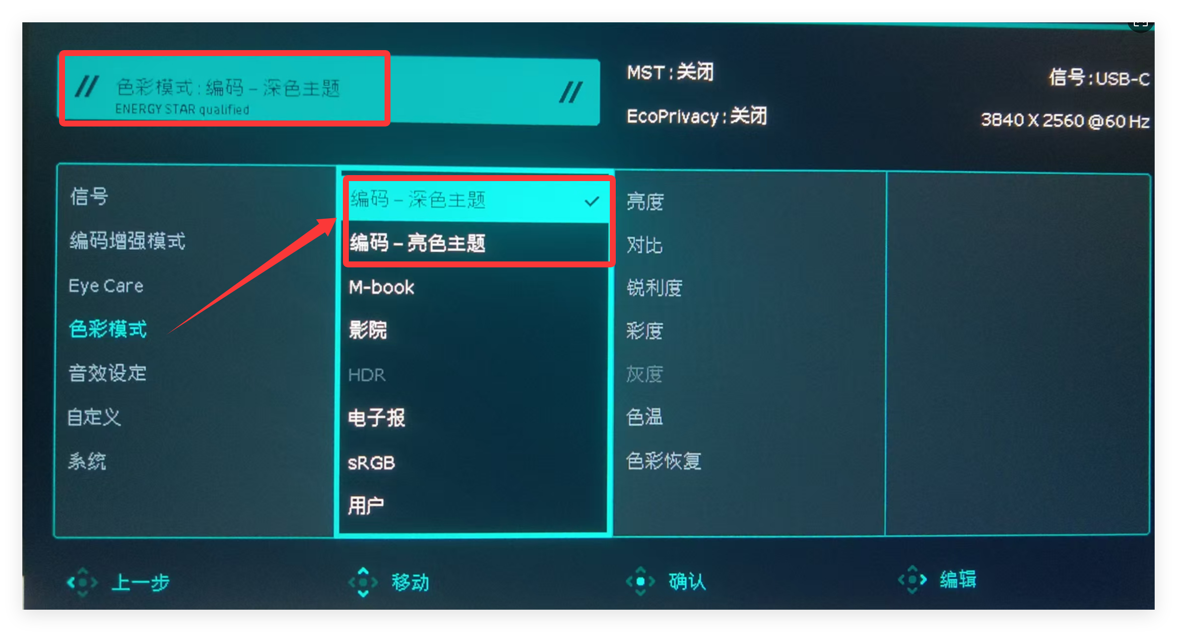 调节猫头鹰模式等级,展示显示器画面亮度变化,可以通过主菜单/编码触键/DP2软件快速调试