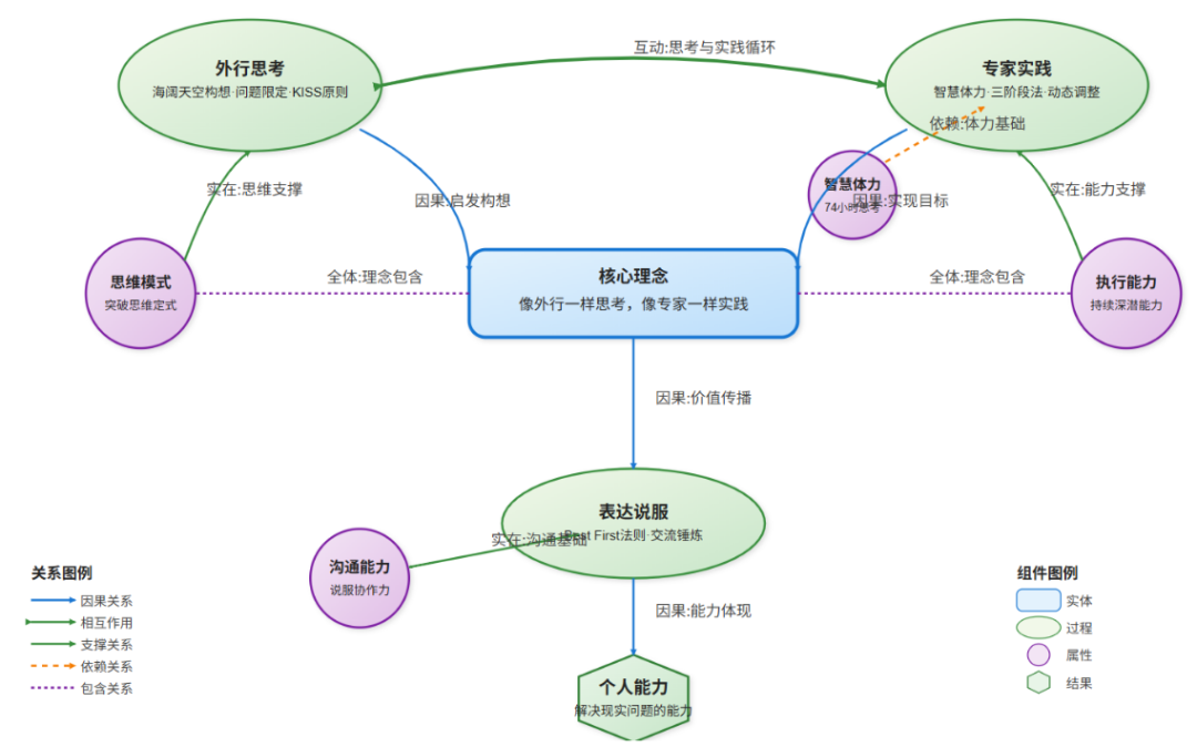 支撑关系和依赖关系则体现了各个能力要素之间的相互依存特征。思维模式支撑外行思考,执行能力支撑专家实践,沟通能力支撑表达说服,智慧体力为专家实践提供基础依赖。这些关系确保了整个体系的稳定性和可持续性。