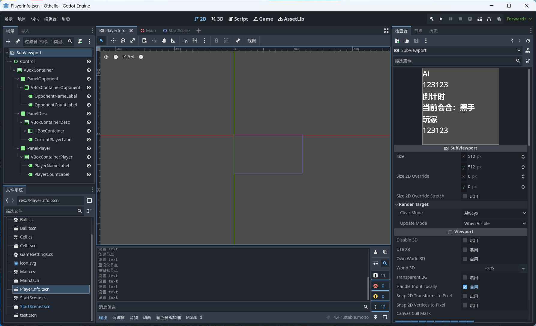 }创建玩家信息场景PlayerInfo.tscn,使用SubViewPort作为根节点,以便能够嵌套入游戏主场景中。该场景分别显示对手信息,玩家信息,倒计时,当前回合,参考场景设置如下: