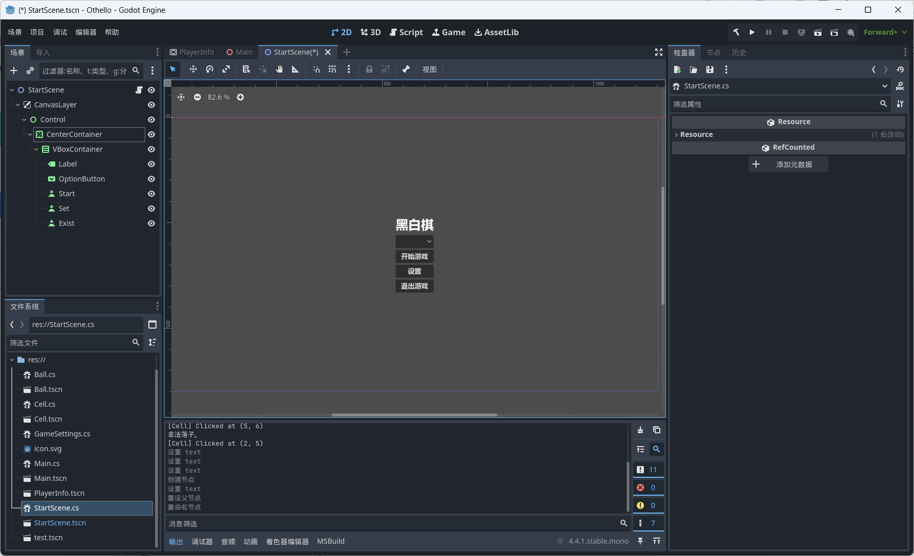 创建场景StartScene.tscn作为游戏的开始界面,分别显示游戏名称,游戏难度,开始游戏,设置,退出游戏,点击开始游戏进入游戏主场景,进行游戏。