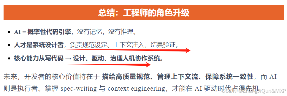 现在“提示词工程”已经过时了,未来是“规范化编程”的时代。也就是说,开发者不用太纠结怎么写提示词,而是要学会制定清晰的规范,告诉AI要做什么,AI来负责具体执行。开发者的角色更像系统设计师,核心价值在于做好规范设计和上下文管理。