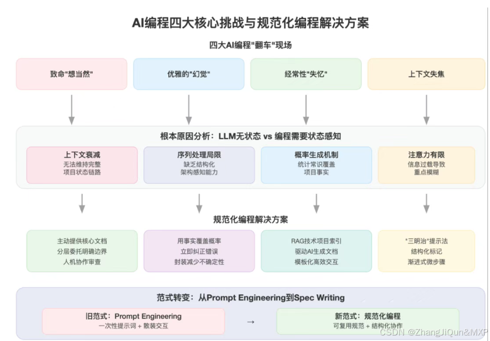 这些问题的根源主要是AI没有“记忆”,没法一直记住项目的完整情况,也就是**“上下文衰减”,而且AI处理信息的方式是按概率生成,注意力也有限。**