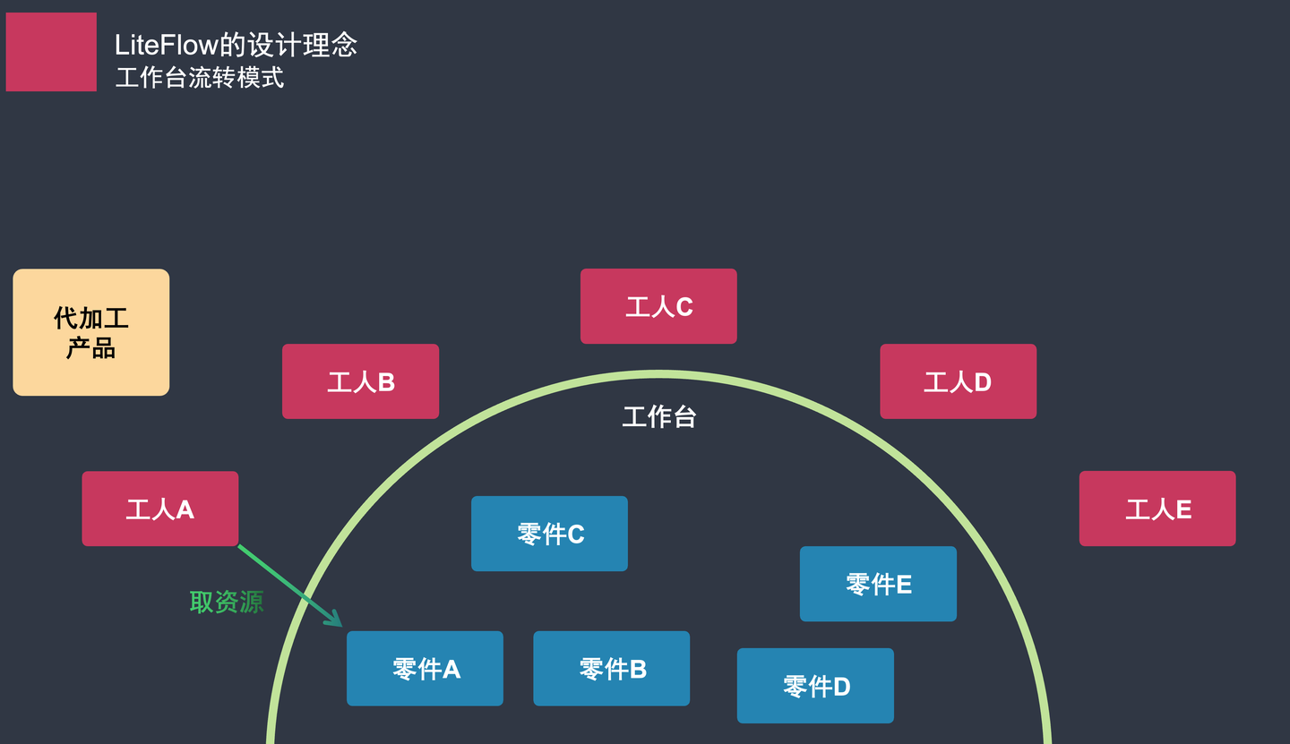 掌握少量关键词就能编排复杂流程,后台组件由专业开发预制好。用户只需理解DSL语法进行组合,这就是**真正的低代码工具**。要实现**零代码**,就需要在DSL之上构建更直观的**图形化工作台**。工作台是实现零代码业务构建的理想界面。参考 LiteFlow 作者的理念:想象一个工作台,不同角色的人(业务人员)可以在上面找到预制好的“原材料”(组件),根据自己的需求进行拖拽、配置和连接,最终组装成一个完整的功能“产品”,然后交付使用。