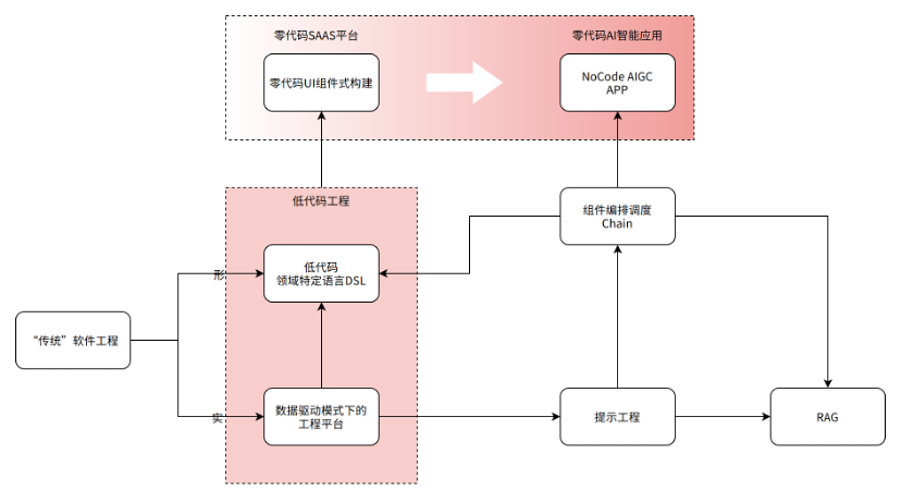 上面的图中,结合本人的实践思考,重新梳理了传统软件工程和低代码工程以及零代码平台的区别,某种意义上,也看到主流的社区,也在尝试使用 AIGC 的能力,打通和低代码工程的最后一公里,来进行智能化的业务应用的逻辑。