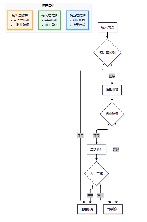 决策层 | 对抗攻击 | 鲁棒性训练 | 置信度监控 | 人工接管 |