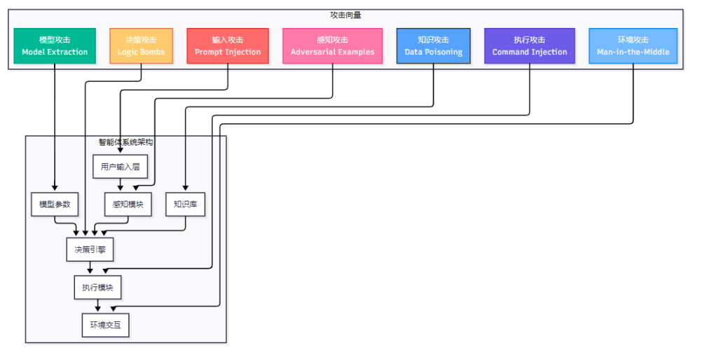智能体系统的攻击向量可以通过以下架构图进行可视化分析: