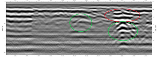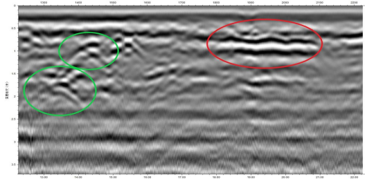 方法:选择合适频率的探地雷达,沿着坝体一道一道拖行,探地雷达向坝体向下发生电磁波,电磁波根据地下介质的不同,反射电磁波,控制端(笔记本电脑)采集软件实时采集相关数据,可以实时反馈出坝体下面的异常情况。通过采集波形图可以判断坝体病害情况。对于异常情况可在软件上实时标记,后期可以根据相关数据对坝体病害进行有针对性治理。采集结果如下图: