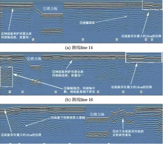 “测线 line14消力池底板处雷达波回波均匀,同相轴连续,底板质量均一;大部分闸底板和护坦的雷达波回波均匀,同相轴连续,底板质量均一;护坦靠近引水闸处底板(约60m,水平桩号距离,下同)底部回波振幅强烈,同相轴中断,可能已经出现一个渗漏通道;该处区域(70~90m)内反射同相轴错位约10ns,雷达波在淡水中的传播速度为0.033m/ns,经计算,可知底板已经发生了最大16.5cm 的沉降;靠近引水闸护坦(30~80m)基础底部的淤泥层分布较厚。“测线 line16消力池底板处雷达波回波较强,同相轴连续,底板质量均一;大部分闸底板和护坦雷达波回波较强,同相轴连续,底板质量均一;闸室底板(-10~0m)同相轴中断,雷达波异常部位多次波来回多次反射,为振幅异常较强部位,闸室底板基础(砂土或淤泥)可能相对密实度较差;该处区域内(70~90m)反射同相轴错位约10ns,根据雷达波在淡水中的传播速度计算,可知底板已经发生了最大16.5cm的沉降;靠近引水闸护坦(51~70m)基础底部的淤泥层分布较厚。“测线 line15消力池底板处雷达波回波较强,同相轴连续,底板质量均一;由于水流波动引起的雷达波回波紊乱,水面平静后雷达波恢复正常,此处(78~90m)为外界因素引起的雷达波异常区;靠近引水闸护坦(10~58m)基础底部的淤泥层分布较厚;该处区域(0~20m)内反射同相轴错位约10ns,根据雷达波在淡水中的传播速度计算,可知底板已经发生了最大16.5cm的沉降。测线line14~line16的雷达图像如下图所示: