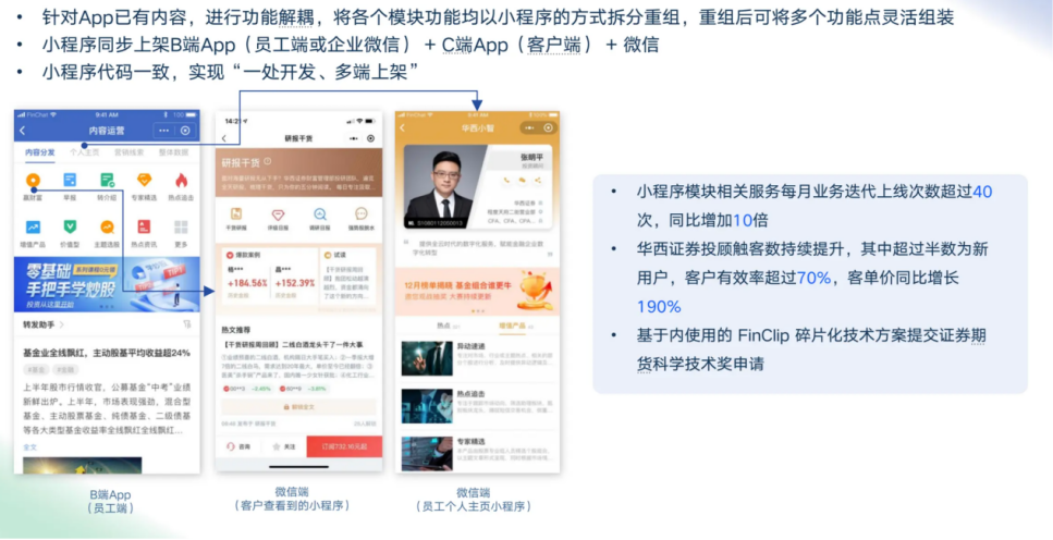轻量化技术的价值不仅在于 “快”,更在于 “省”:某券商测算显示,采用小程序容器技术后,年度研发投入减少 30%,运维成本降低 40%,而新功能上线数量增加 200%。这种 “降本增效” 的能力,让券商可以将更多资源投入到用户体验优化上,形成正向循环。