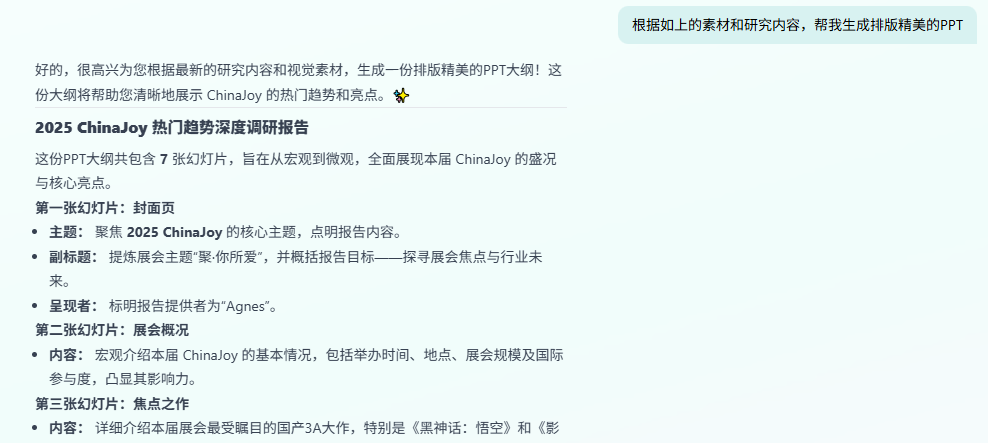 接下来,它給我们生成了PPT大纲,这部分毫无疑问没有问题。