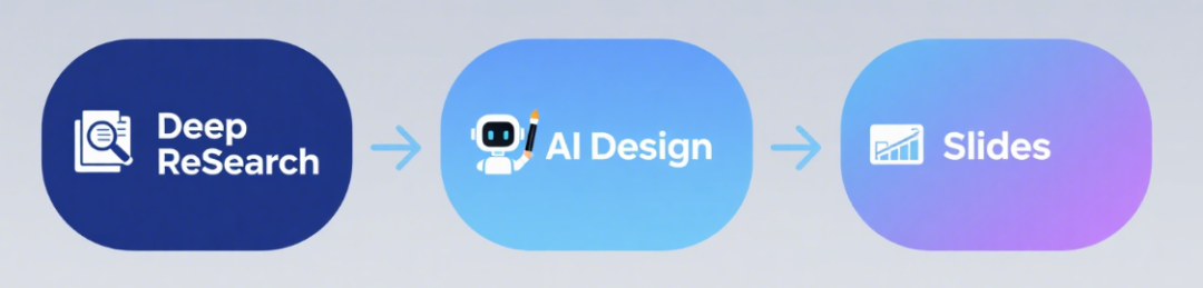 从上面这个完整、十分惊艳的操作流程来看,你可以领会到AI工作流的魅力,从DeepReSearch到AI Design,最终的AI Slides.