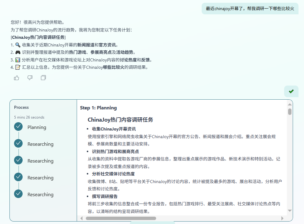 比如,这两天ChinaJo在上海开幕了,朋友们肯定很好奇这是个什么活动,像获得一手信息源,现在直接用它的DeepSearch功能,先帮你整理一份完整的研究报告给你~