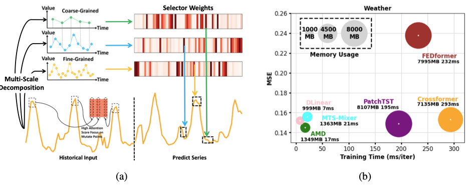 本文提出的自适应多尺度分解(AMD)框架,通过MLP架构实现了多尺度时序模式的高效建模,兼具Transformer的表达能力和MLP的效率。其核心创新在于: