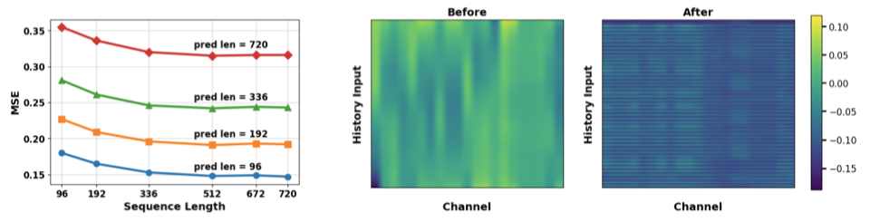 多尺度信息的价值:输入长度L越大,性能提升越显著,证明AMD能有效利用长程历史信息。 通道依赖的陷阱:跨通道交互可能引入噪声,需通过系数beta抑制。
