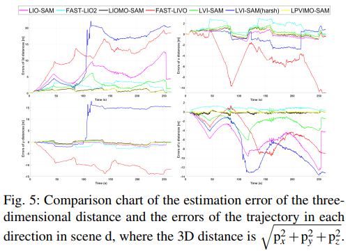 图5的场景d误差分析进一步揭示了各系统的性能差异。LIO-SAM的主要误差集中在Z轴(峰值超2米),反映了缺乏垂直约束的固有缺陷;FAST-LIO2虽抑制了Z轴漂移,但XY平面误差显著大于LPVIMO-SAM;而LPVIMO-SAM在所有坐标轴上的误差均稳定维持在±0.5米以内。这种全方位的精度优势印证了多传感器紧耦合的设计理念。
