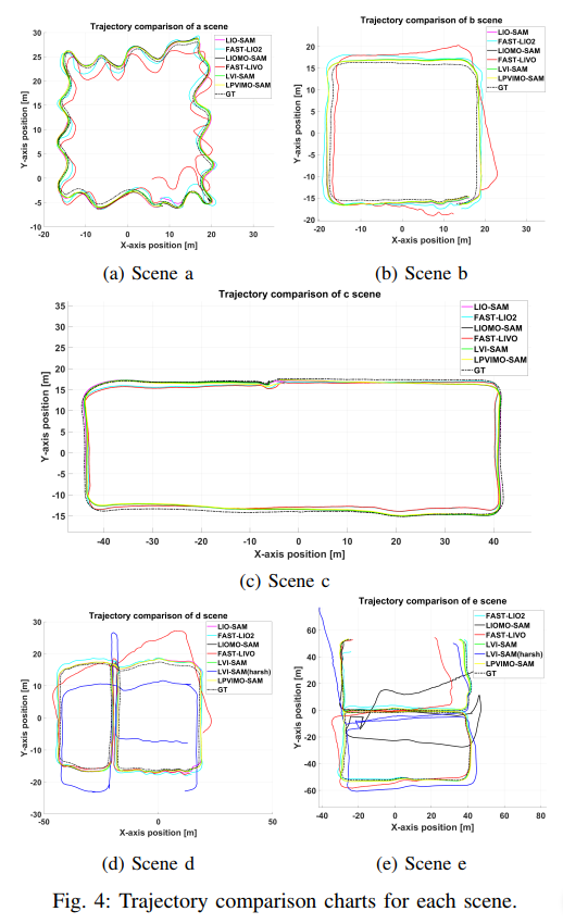 如表1所示,这些场景精心覆盖了曲折路径(场景a)、高动态干扰(场景b/d)、LiDAR退化(场景c/e)等多种挑战条件,总测试轨迹达1.28公里,为结论的可信度提供了坚实基础。