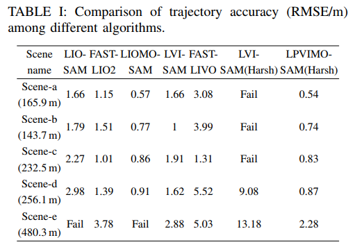 在基准方法选择上,作者兼顾了传统方案(LIO-SAM)、先进滤波方法(FAST-LIO2)和紧耦合优化框架(LVI-SAM,FAST-LIVO),形成了层次丰富的对比体系。