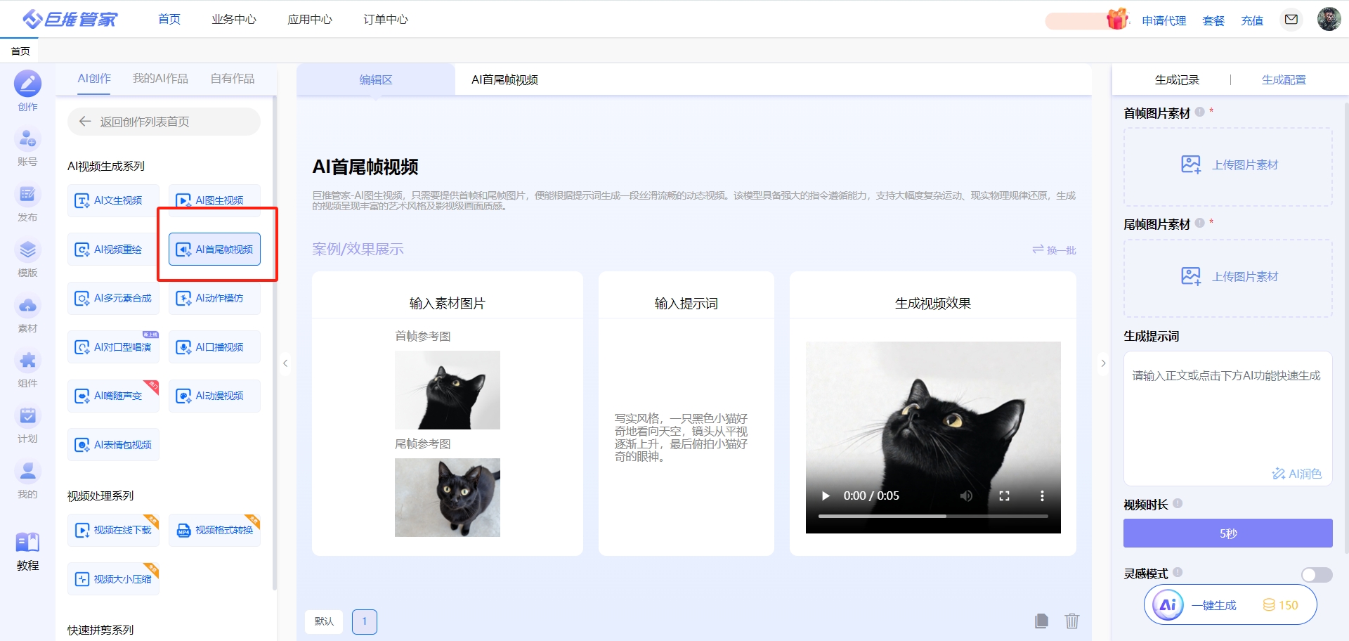 作为2025年崛起的新锐工具,巨推管家AI首尾帧视频制作网站以“全流程自动化”为核心竞争力,重新定义了首尾帧视频的制作效率。其核心优势体现在三大维度: