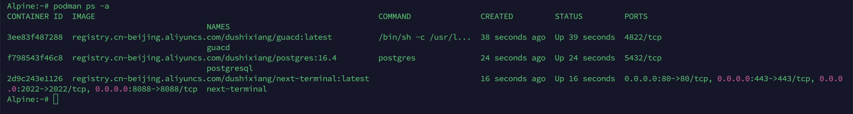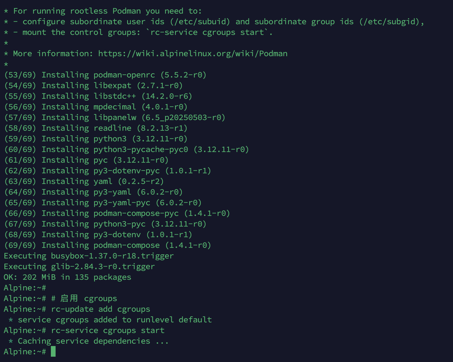 根据官方文档,采用以下命令进行安装,参考:https://wiki.alpinelinux.org/wiki/Podman