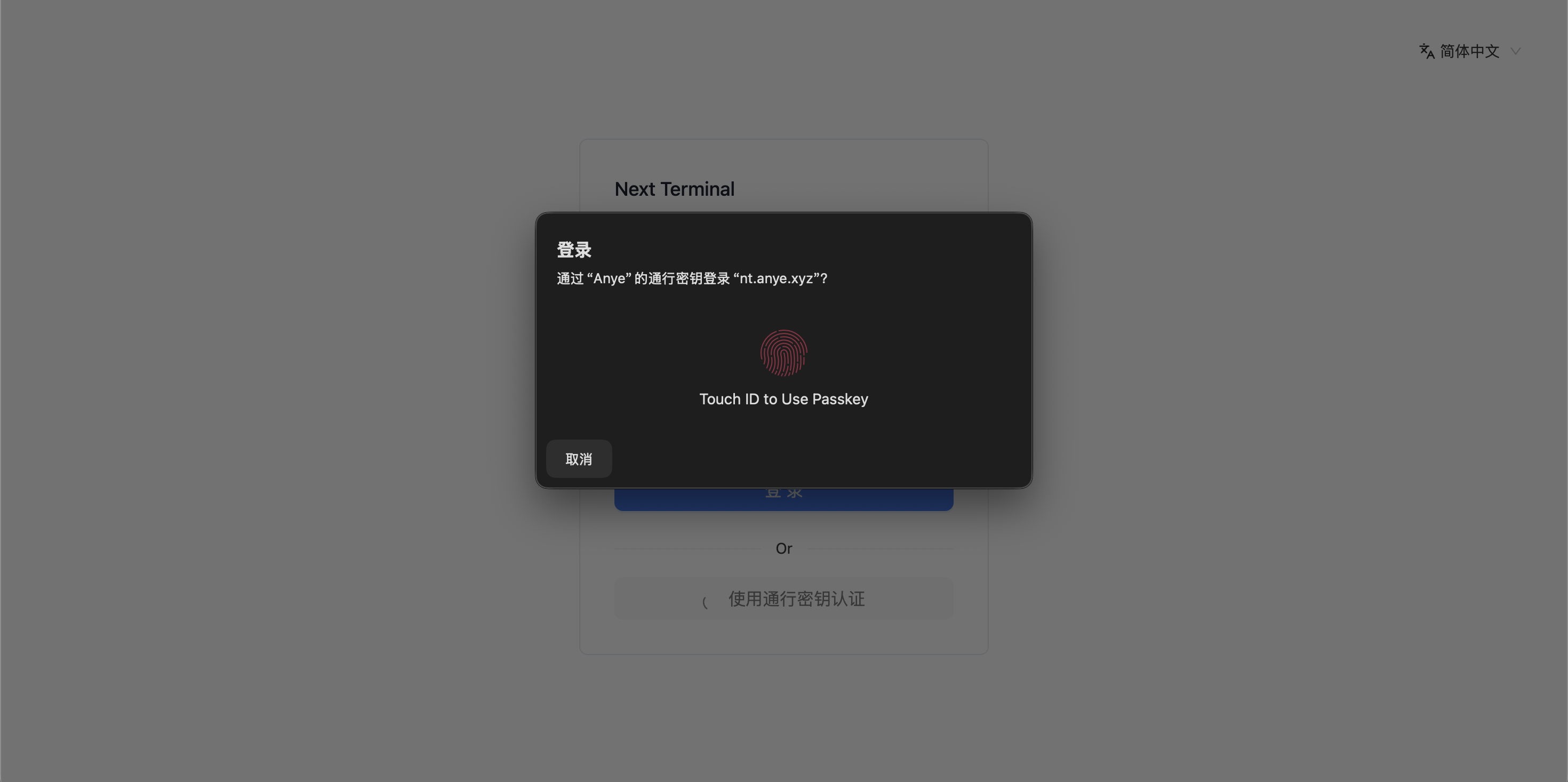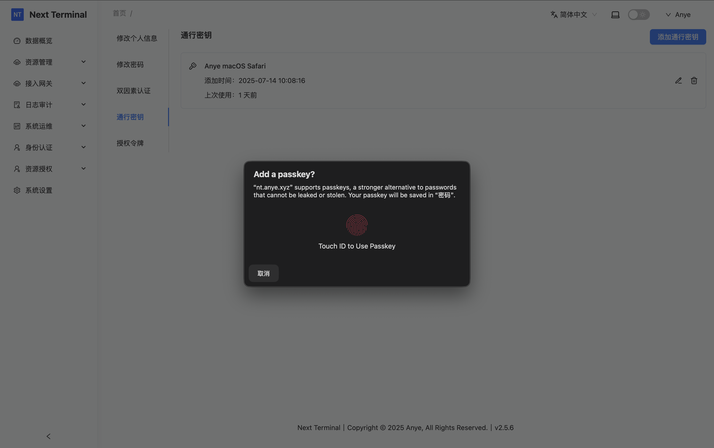 添加后,即可使用指纹 进行登陆 Next Terminal 。这里建议同时配置 双因素认证。