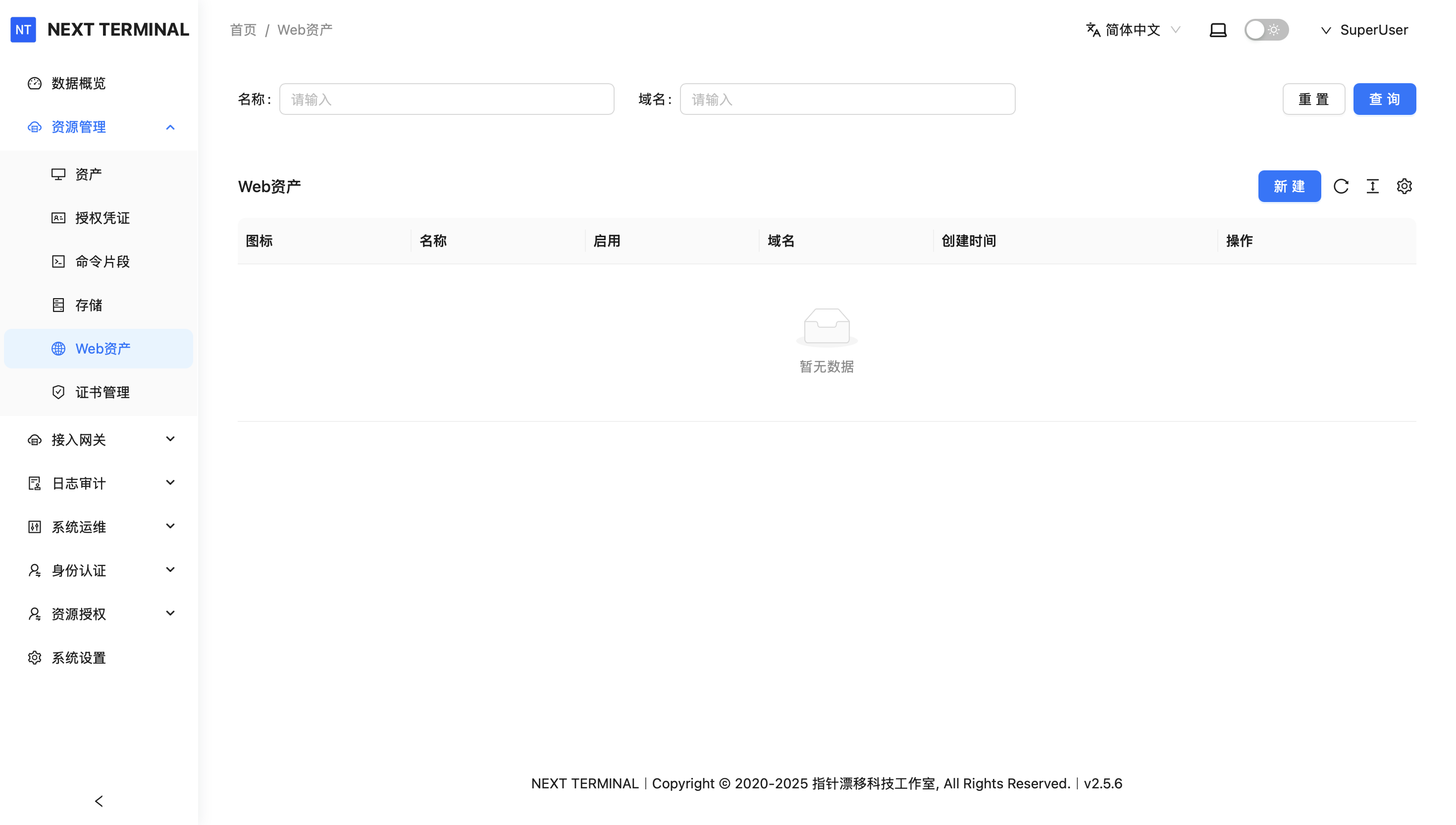 点击侧边栏 资源管理 - Web资产 ,点击新建: