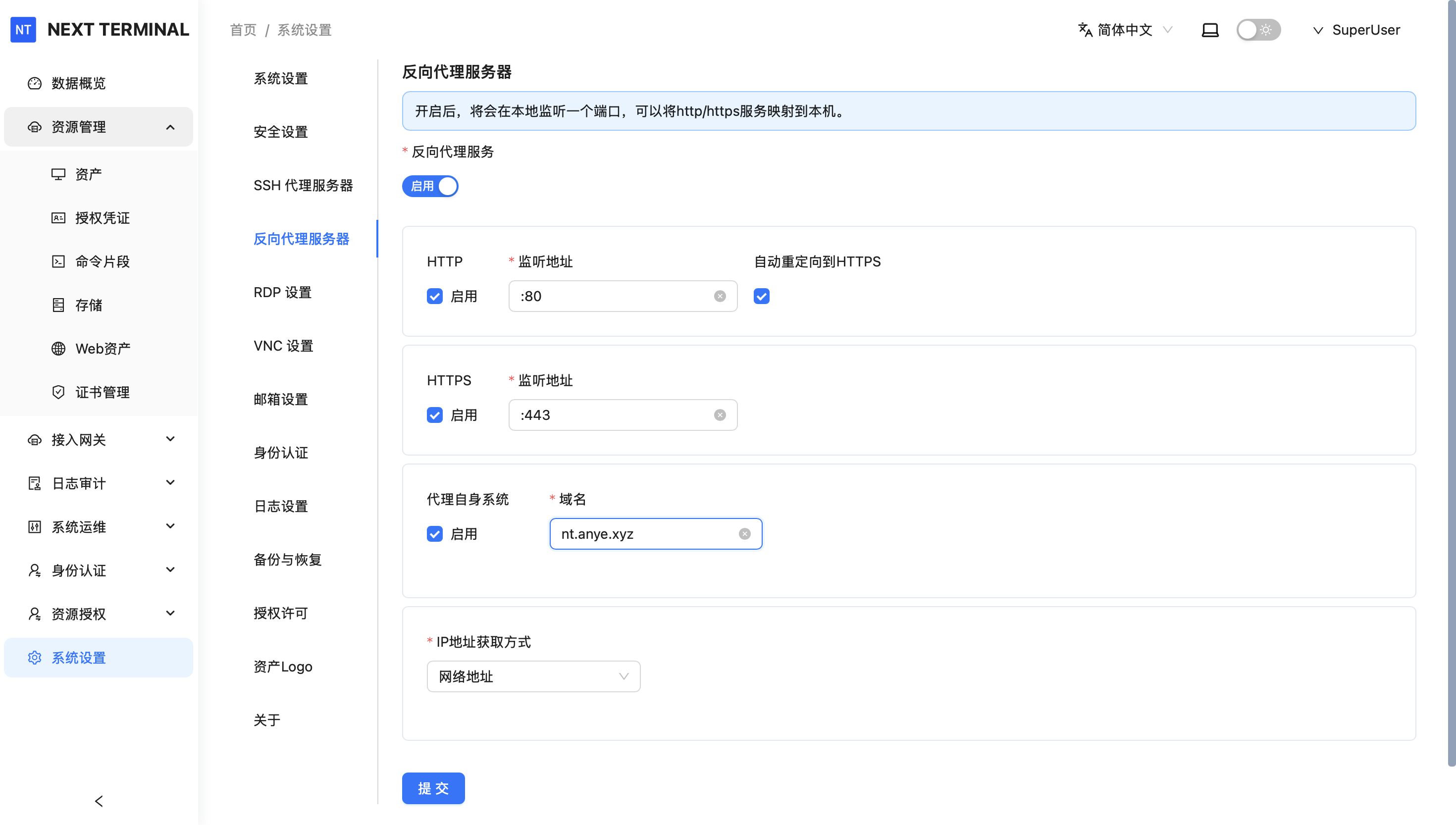 点击 系统设置 - 反向代理服务器 ,点击 启用 ,按需填写添加端口等信息,域名填写面板的域名,如此处:nt.anye.xyz,点击提交: