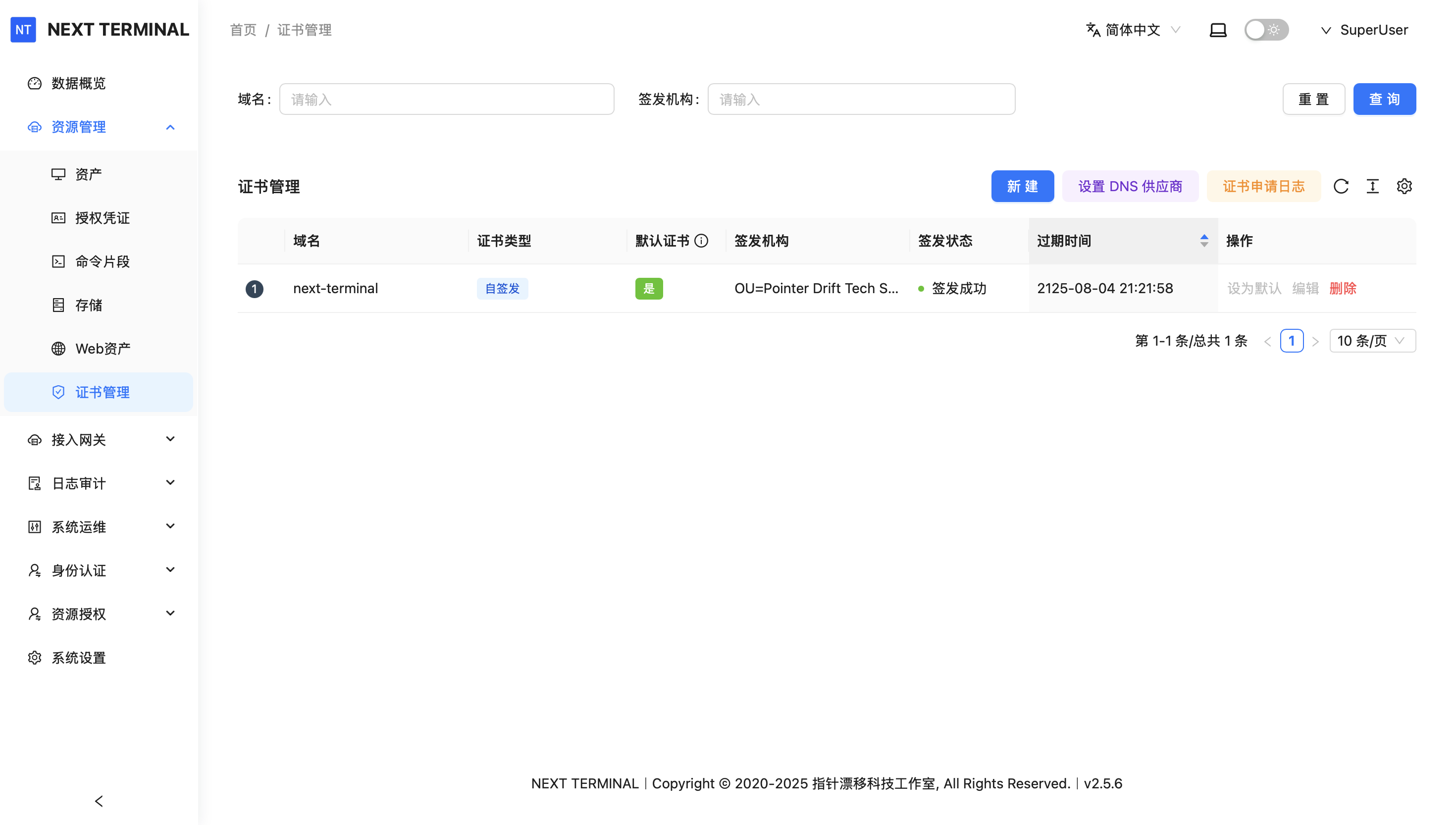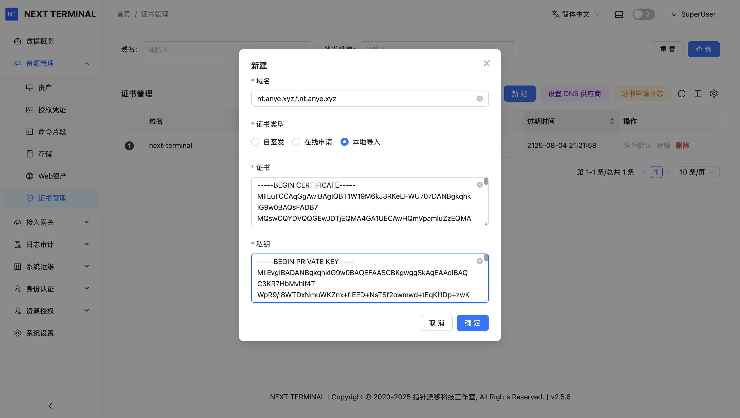 点击侧边栏 资源管理 - 证书管理 ,这里我将采用本地证书的方式进行演示: