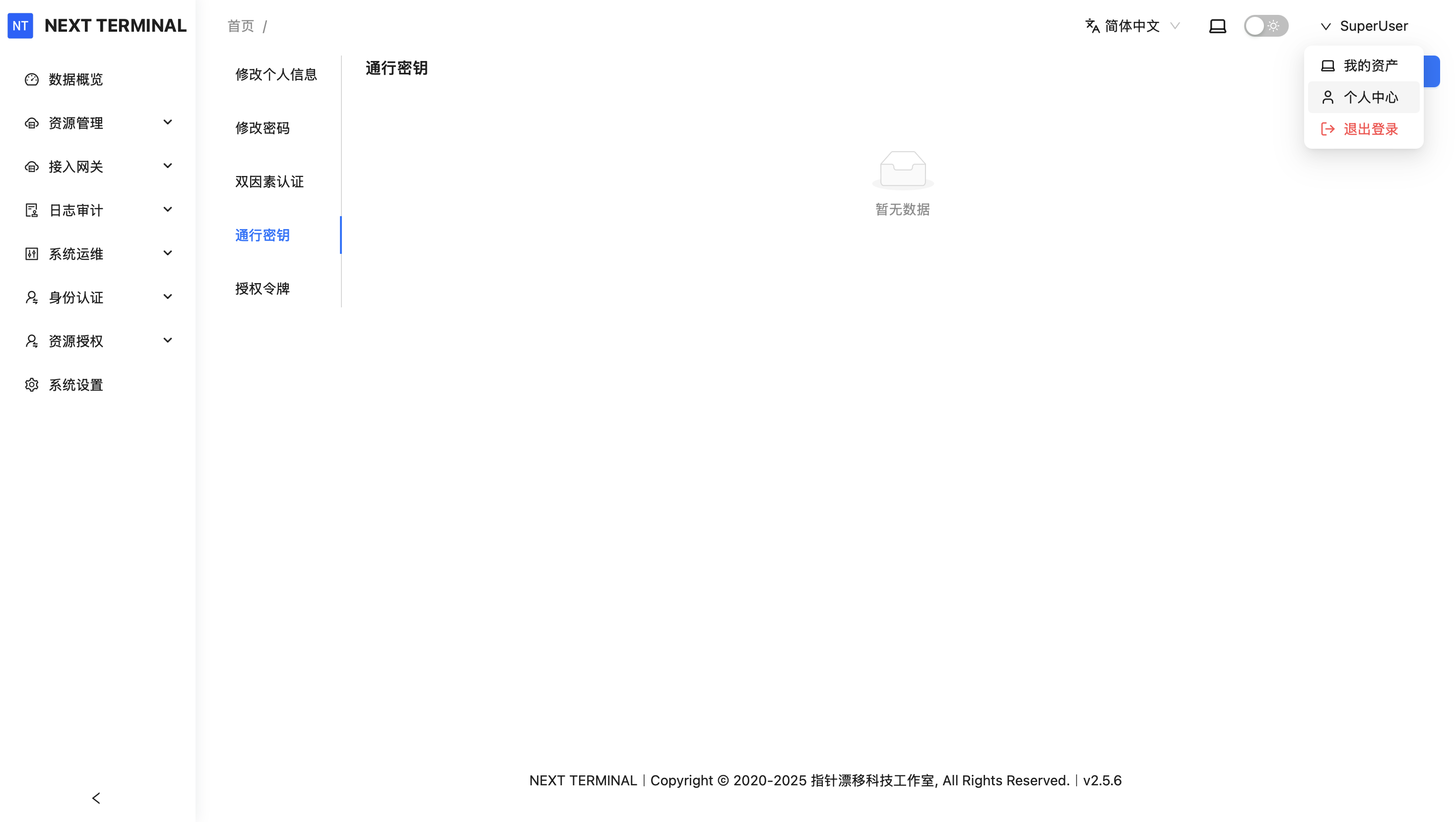 点击右上角进入 个人中心,点击 通行密钥 ,创建: