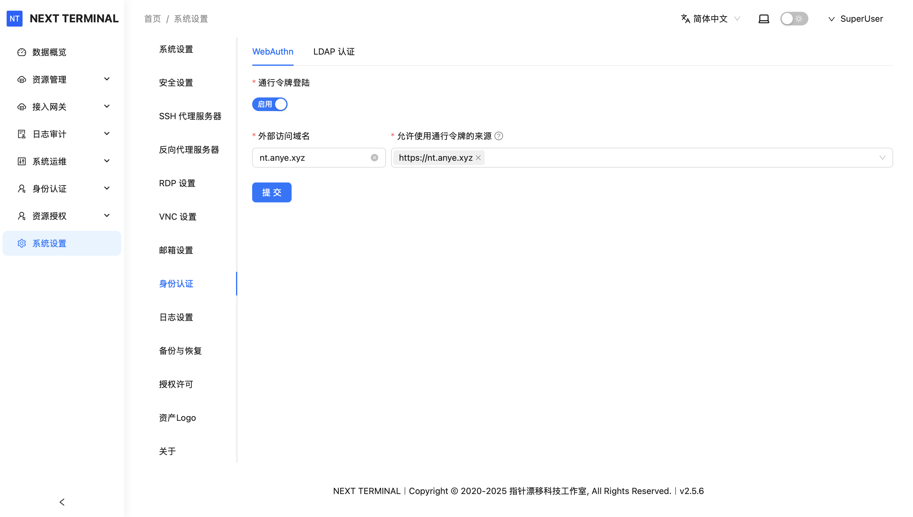 点击 身份认证,启用通行令牌登陆,外部访问域名填写面板域名,如此处:nt.anye.xyz;允许使用通行令牌的来源填写面板访问链接,如此处:https://nt.anye.xyz ,点击提交。