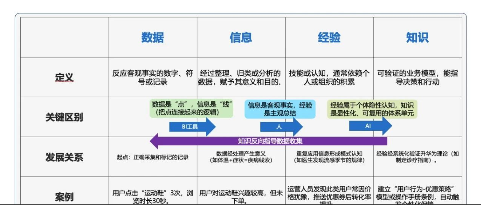 经验属于个人的隐性认知,而知识则是显性化、可复用的体系单元。在企业中,将运营人员的个人经验(例如,当用户浏览某运动鞋详情页但未下单时,向其发送优惠券)转化为可供AI直接使用的模型,才是真正完成了知识的转化。