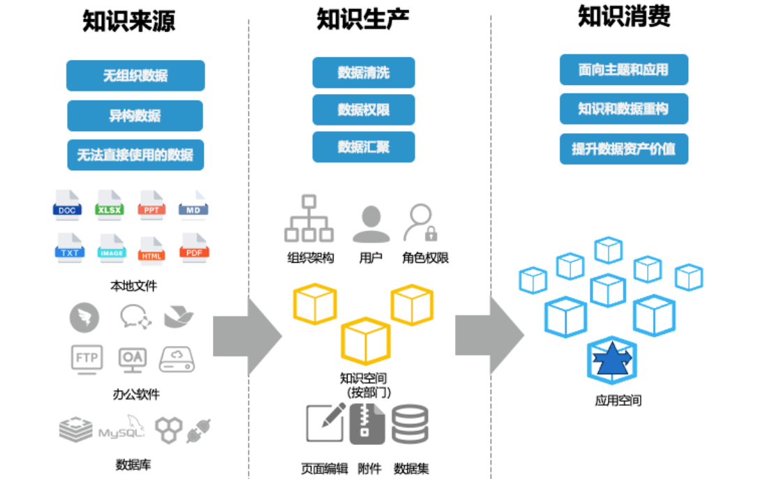 知识导入 知识的来源多种多样,包括本地文件(如Word、Excel、PDF)、企业原有系统(如OA、数据库)、互联网上的外部知识,以及纸质文档等。知识导入的任务就是为这些来源提供入口,并通过自动化方式批量导入。
