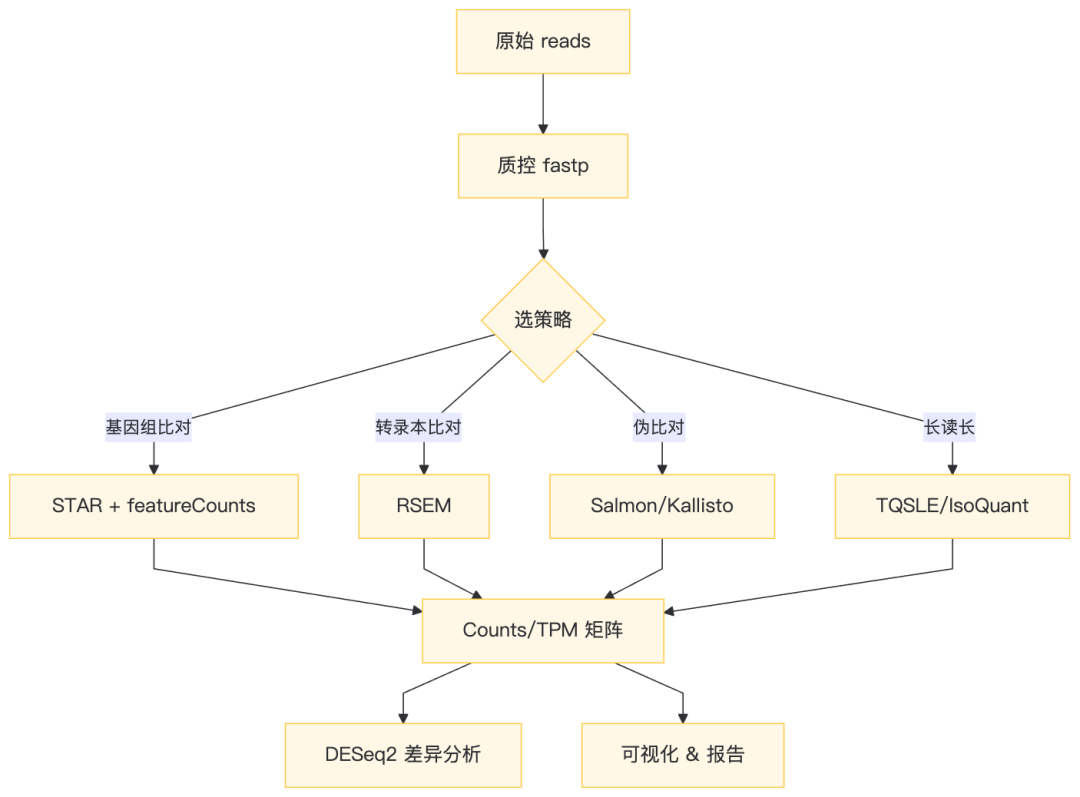 差异分析工具(DESeq2、edgeR)只吃 raw counts,它们自己会做归一化(Love et al., 2014)。