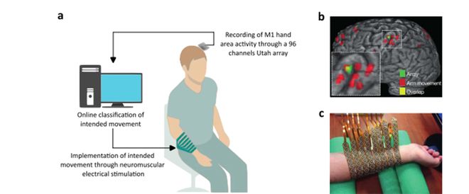 该BMI系统的目的是帮助一位高位截瘫的参与者“重新掌控”自己的手部动作。具体来说,他们在这位参与者左侧大脑——控制右手运动的区域——植入了一块96通道的电极阵列(图1a),用来记录大脑在试图移动手部时产生的高频神经信号。然后,研究团队通过支持向量机对这些信号进行解码,判断参与者想要进行的具体动作。接下来,被“读懂”的运动意图并不会停留在大脑里,而是通过一套定制的神经肌肉电刺激(NMES)袖套(图1c)传导到手上,从而让这位参与者的手重新“动起来”。此外,研究者还借助fMRI扫描(图1b),定位了与手部运动相关的脑区和电极植入位置,确保整个系统的精确性。