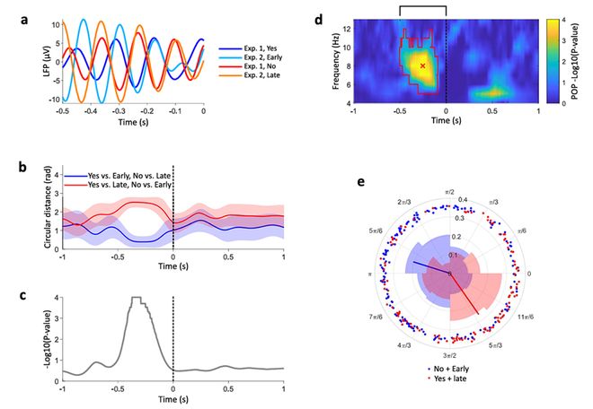 更有趣的是,这个效果集中在8Hz左右的频率,而这一频段正是我们熟知的运动相关mu节律频率。图2f显示,高主控感与低主控感的试次,在这个时点呈现出完全相反的相位分布。这种“相位对立”是研究首次在人类中如此清晰地观察到的主控感神经标记。